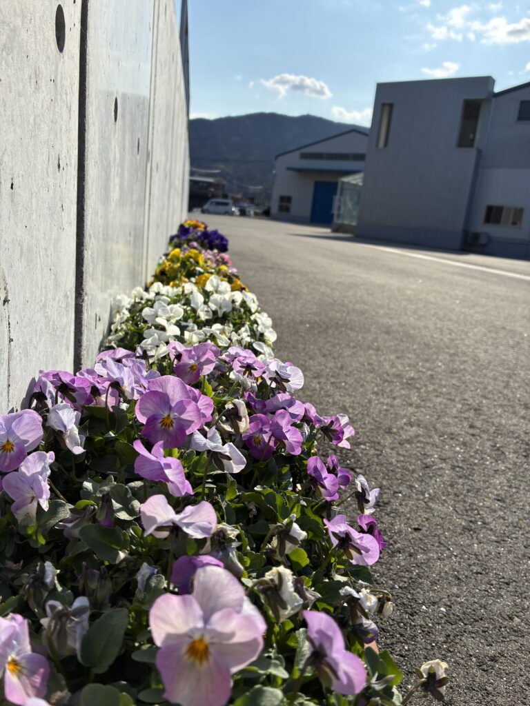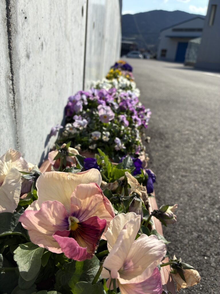 会社の玄関前に置いています、プランターにパンジーとビオラが咲き乱れています。
